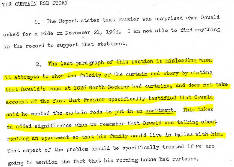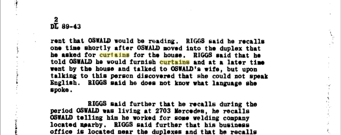 Lastly, the whole curtain rod saga is not without precedent. His landlord at 2703 Mercedes St., Chester Riggs, told the FBI that the one and only conversation he had with Oswald after renting the place to him, was in regard to Oswald wanting… that’s right… curtains for the place…